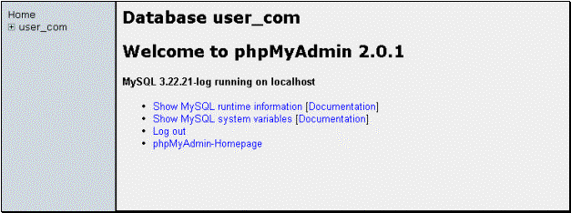 5. Click on the Home link in the left frame to return to the phpMyAdmin page or the yourdatabase name link to return to the main page to administer your database. |